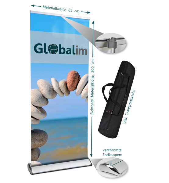 Das Rollup Deluxe überzeugt durch seine breitere, besonders stabile Konstruktion und sein elegantes Erscheinungsbild. Die verchromten Endkappen und die edle Tragetasche verleihen dem Rollup-System eine hochwertige Optik, ideal für professionelle Präsentationen bei Messen, Events oder im Showroom. Im Vergleich zu den Premium-Modellen bietet die Deluxe-Variante nicht nur mehr Stabilität, sondern auch eine breitere Basis, die für zusätzliche Standfestigkeit sorgt.